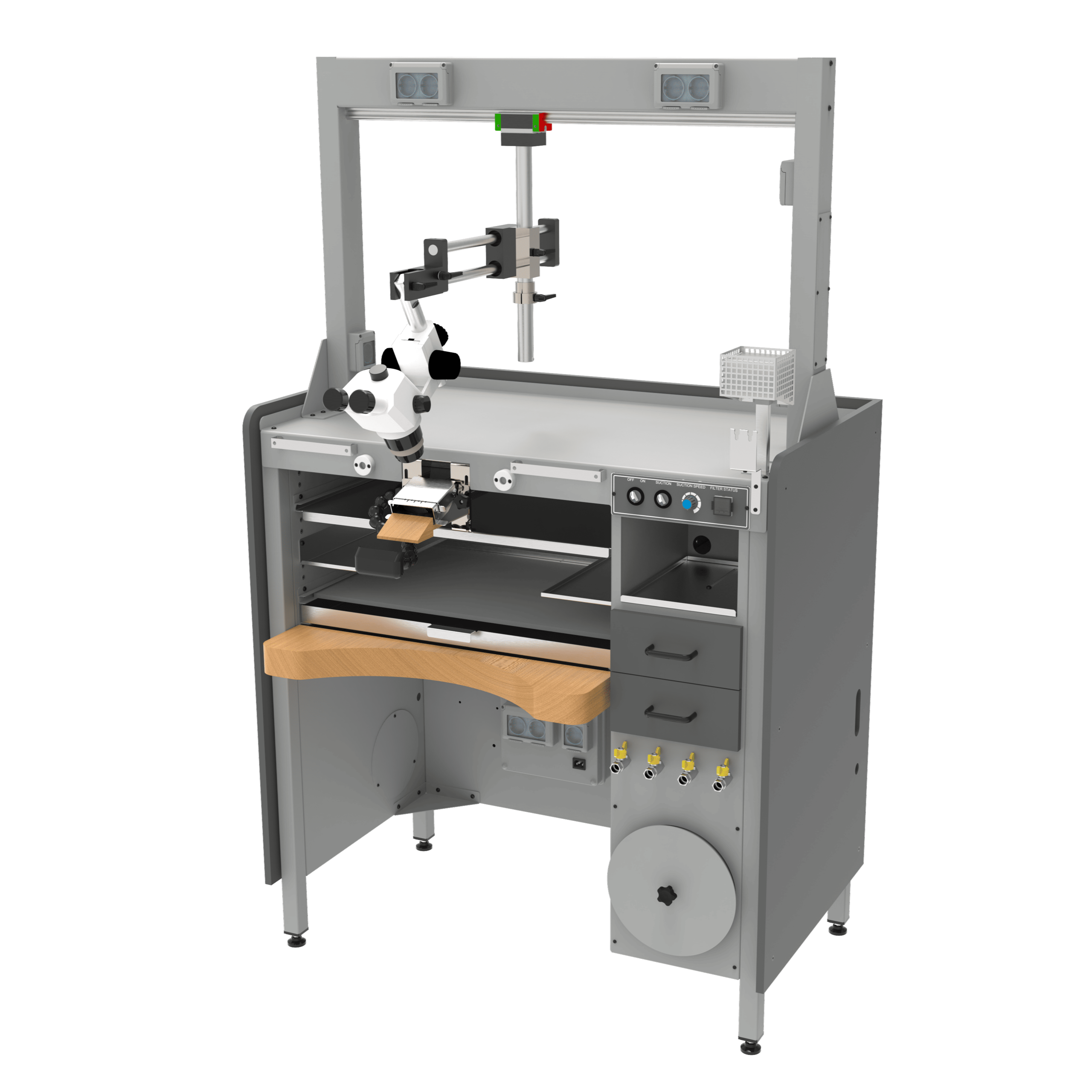 Il banco da orafo TM-3 è stato progettato con cura per offrire un ambiente di lavoro ergonomico, efficiente e altamente funzionale. Questo banco è stato concepito con un focus particolare sull’ergonomia e sull’utilizzo del microscopio, garantendo un supporto ottimale per gli orafi impegnati in lavori di precisione. Grazie alle numerose regolazioni disponibili, il banco ‘TM-3’ offre la flessibilità necessaria per adattarsi alle preferenze e alle esigenze di tutti gli operatori. La versatilità delle regolazioni consente di trovare la posizione più consona, migliorando il comfort durante le lunghe sessioni di lavoro e promuovendo la precisione nelle operazioni quotidiane. Il ‘TM-3’ rappresenta dunque la scelta ideale per gli orafi che cercano una soluzione completa, combinando l’ergonomia avanzata, la precisione nella lavorazione e la massimizzazione dell’aspirazione per un ambiente di lavoro più sicuro e produttivo.