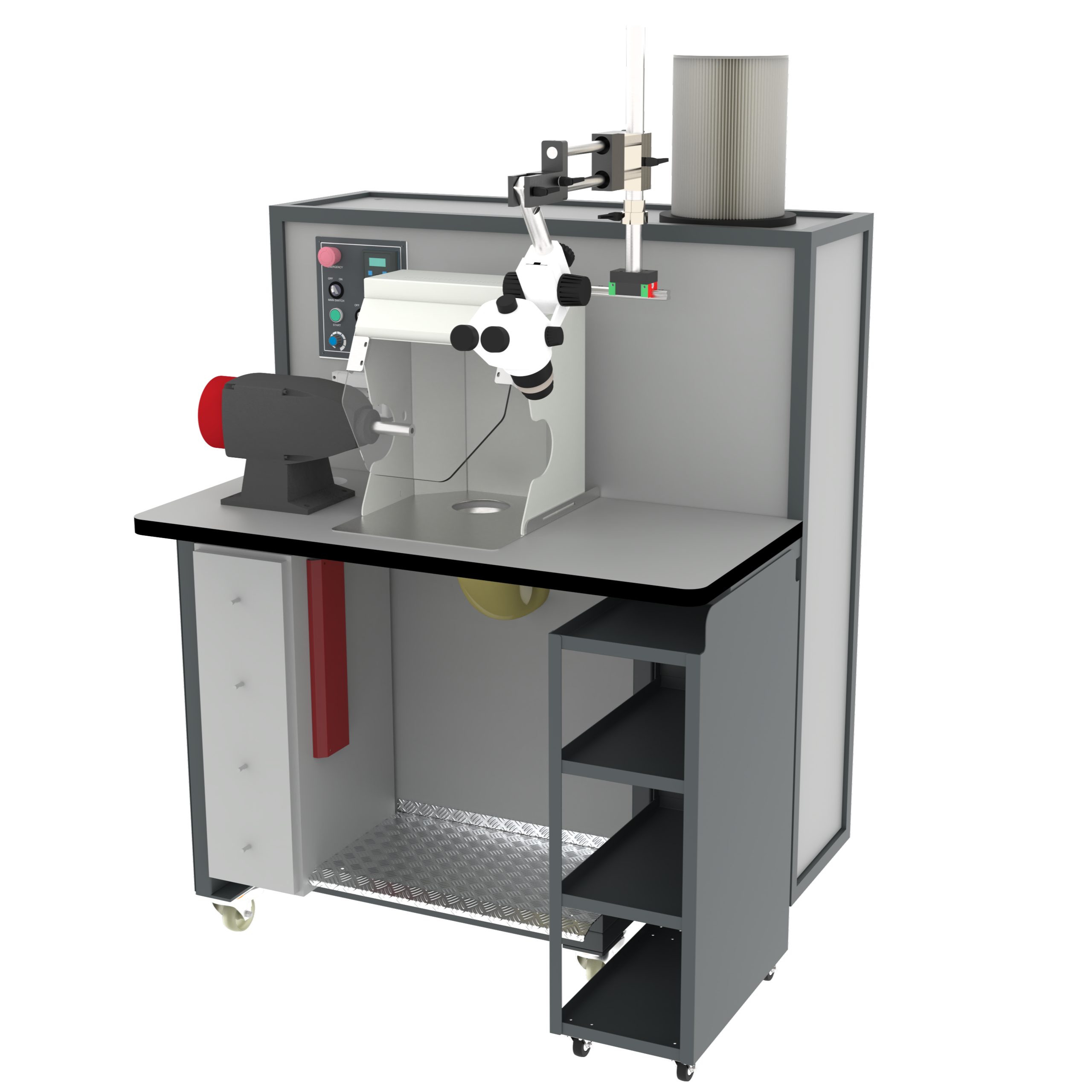 Un ulteriore vantaggio è rappresentato dal carrello estraibile con ruote, integrato nella struttura del banco, che facilita lo stoccaggio e lo spostamento di attrezzature o materiali di supporto, migliorando l’efficienza complessiva della postazione.